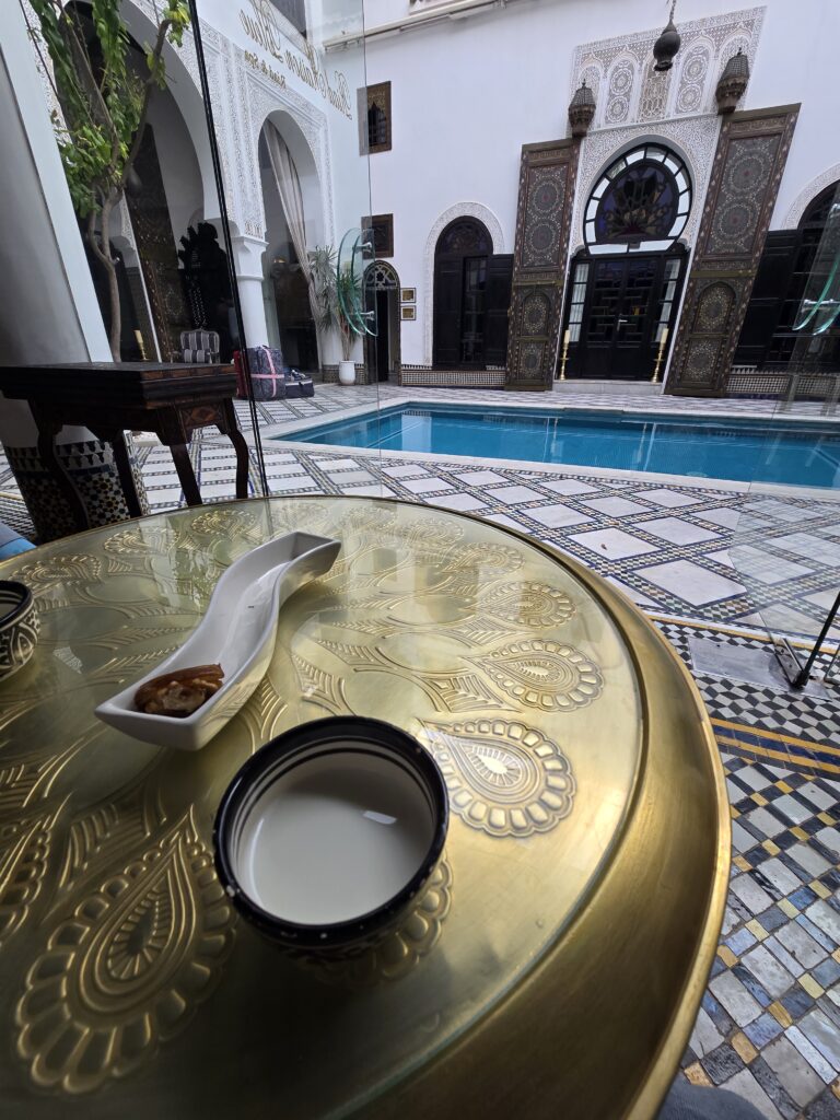 The drive from Casablanca to Fez is roughly 4–4.5 hours, so Soufiane took us straight to our accommodations for our two-night stay in Fez: Riad La Maison Bleue, where we received our first taste of Moroccan hospitality with trays of rose milk, pastries, and nuts. A riad, I learned, is more than just a boutique hotel—it’s a traditional Moroccan house built inward around a central courtyard or garden, usually hidden behind a plain exterior door in the medina. Step inside, though, and you’re suddenly in another world of tiled courtyards, carved wood, fountains, and birdsong. La Maison Bleue was our first riad, and the moment we crossed its threshold, Morocco started to feel not like a place we were visiting, but like a home we were being welcomed into.