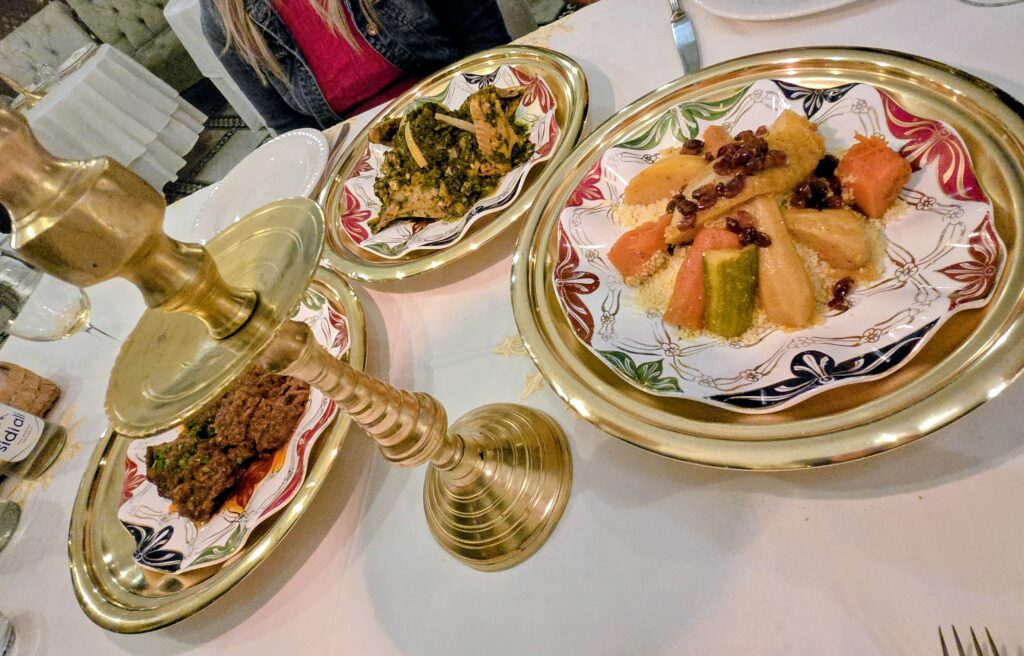 That first evening, we were also introduced to our first traditional Moroccan cuisine: tagine. A tagine is both the name of the dish and the conical clay pot it’s cooked in. Meat, vegetables, dried fruits, and spices are layered inside, then slow‑cooked so the steam circulates under the lid and everything gently braises in its own juices. The result is fall‑apart tender, fragrant with cumin, saffron, ginger, and preserved lemon—a kind of edible welcome to Morocco. We would come to enjoy tagine in many variations over the course of our trip—chicken, lamb, goat, (gasp camel), vegetable, sometimes sweet with figs or apricots—as it’s an integral part of the Moroccan diet and appears on almost every table.