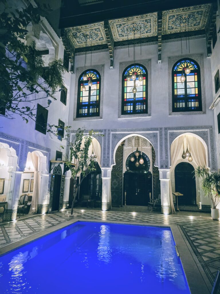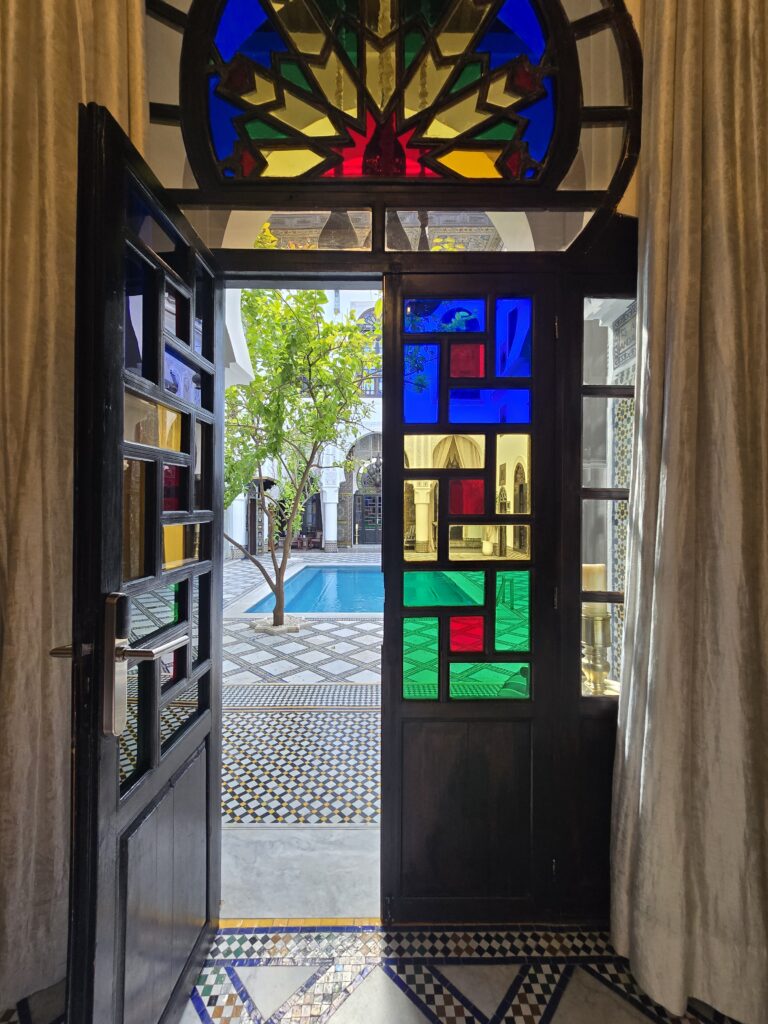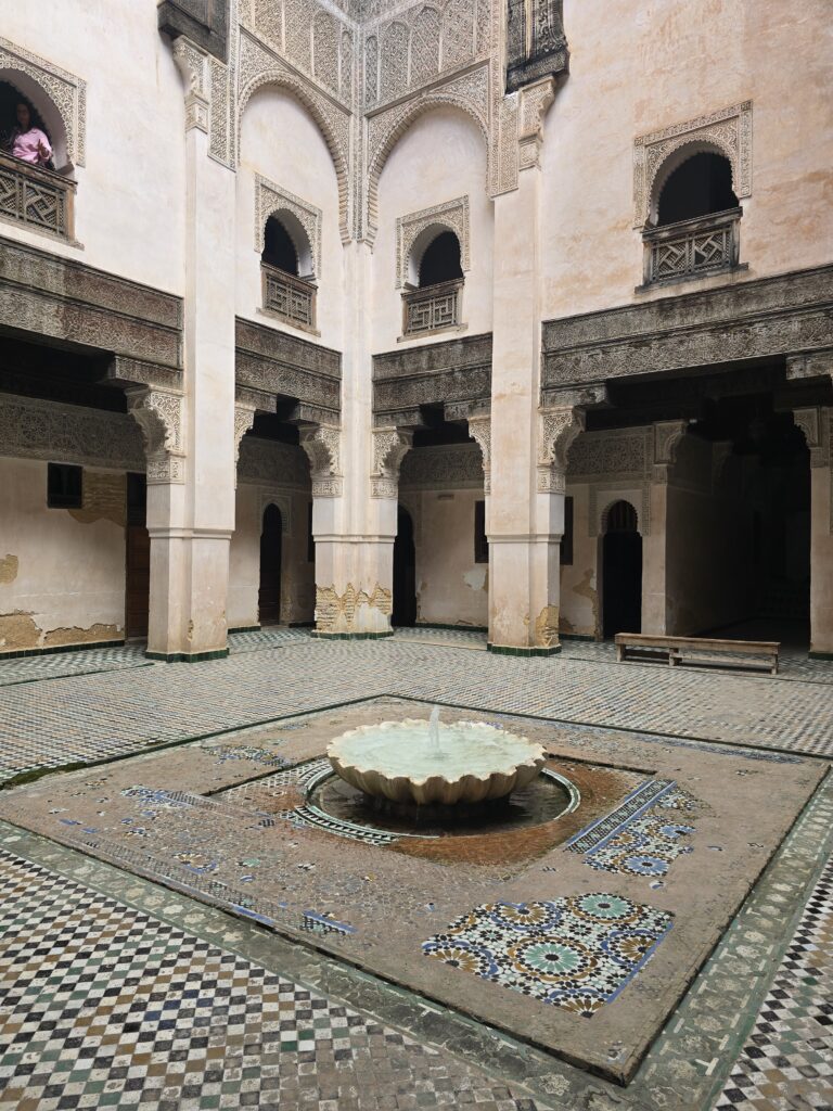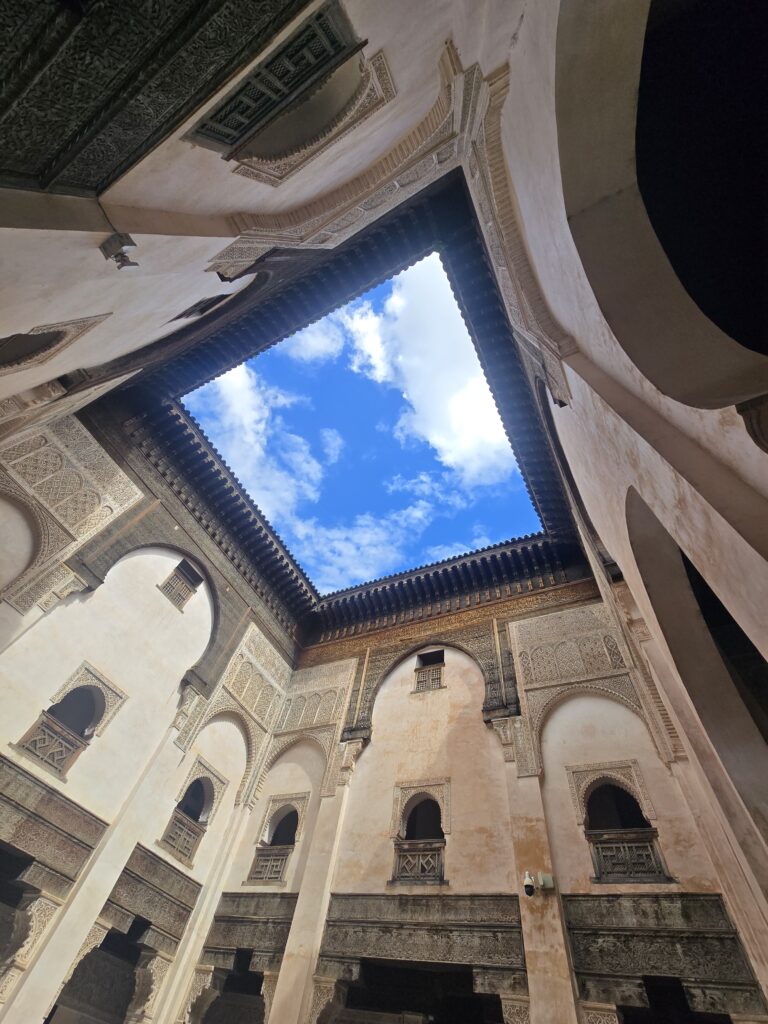 From the outside, the building was almost unremarkable, another sand‑colored façade along a narrow lane. Inside, it opened into a light‑filled atrium wrapped in galleries and archways. The floors and walls were clad in vibrant zellij tilework—geometric patterns in deep cobalt, emerald, and sun‑warmed ochre—framing carved cedar columns and railings that, incredibly, were original. The wood glowed with the patina of centuries.
