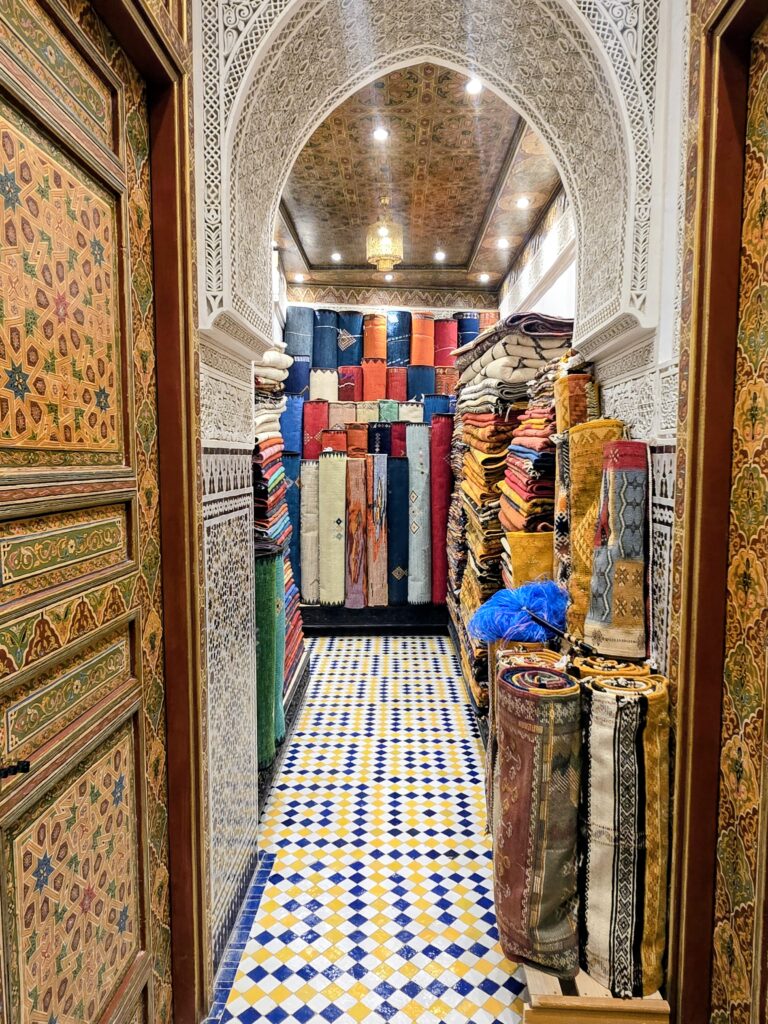 We didn’t actually see anyone at the loom here—that glimpse would come later in another part of Morocco—but standing in that sunlit courtyard, surrounded by stacks of hand‑knotted work, it was easy to imagine the hours and stories woven into each piece.