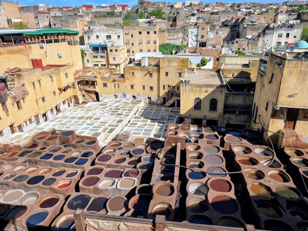 Fez’s Chouara Tannery is one of those places you’ve probably seen in photos long before you arrive: a honeycomb of stone vats filled with opaque, jewel‑toned liquids, hides draped over railings, workers standing waist‑deep as they knead leather with their feet. To reach the famous viewpoint, we wound through a leather shop and up several flights of stairs, past shelves of bags, jackets, poufs, and babouche slippers in every color.