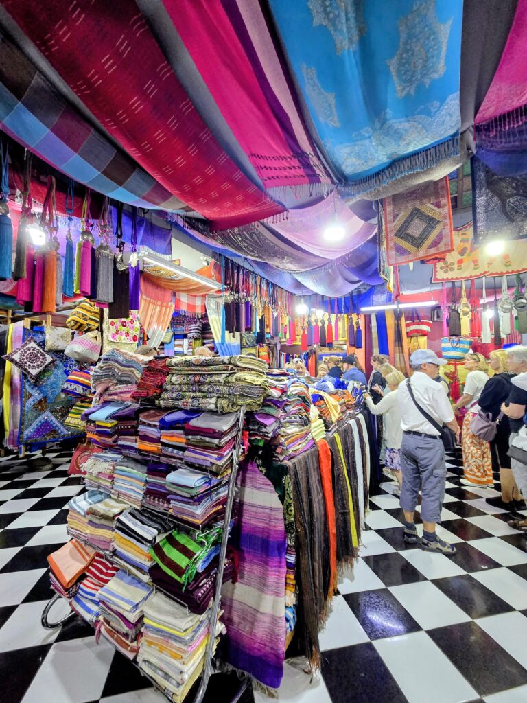 Arab designs, by contrast, lean more towards symmetry and intricate, repeating geometric patterns—starbursts, borders, and medallions that echo the tilework and carvings we’d been admiring all morning. The effect is more formal, almost architectural, whereas Berber pieces often feel more personal and spontaneous.