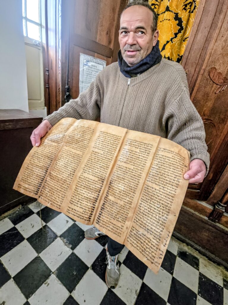 Inside, our guide patiently walked us through the layers of symbolism—Hebrew inscriptions, carved motifs, the placement of the bimah and ark. He showed us part of a Torah printed on goat skin, carefully stored and brought out for us to see. Even in its worn state, it felt precious, a tangible link to a community that had once filled this space with prayer and song.