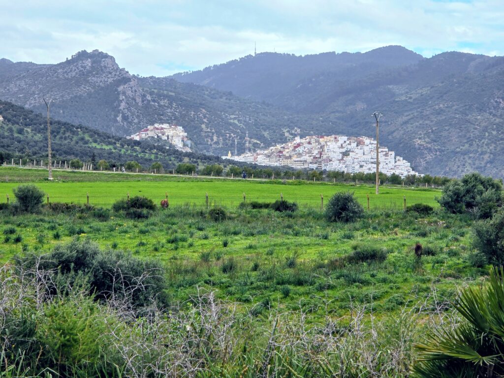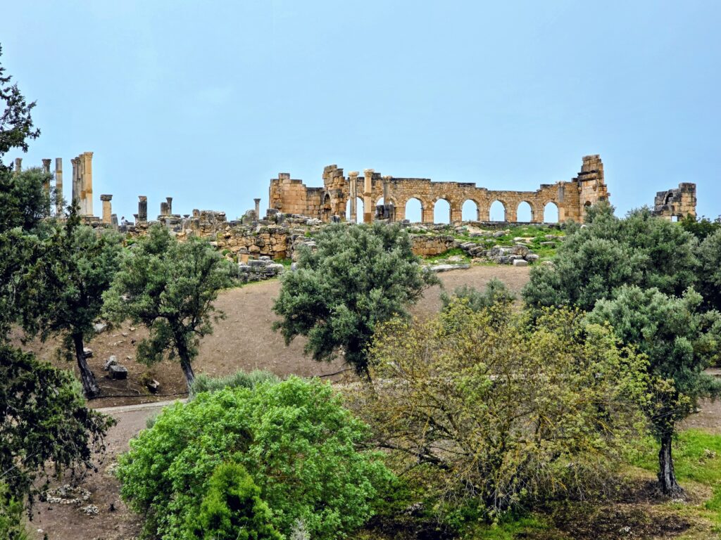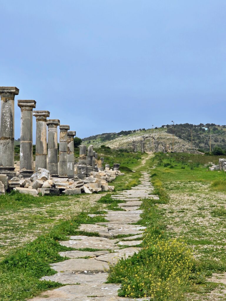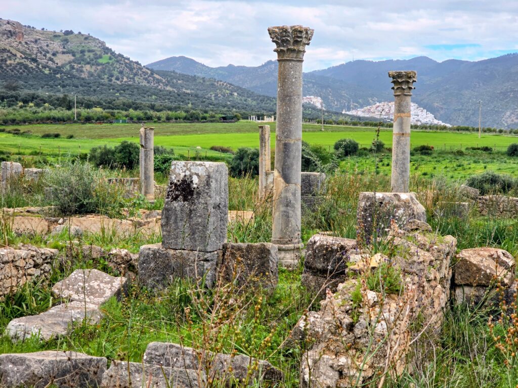 From the hillside, you can look out over fields and olive groves that stretch to the horizon, and in the distance, a nearby whitewashed village. From Volubilis, it appears almost like a seated camel outlined against the landscape—a small, quiet shape that somehow anchors the whole view. Standing among the broken columns with the wind moving through the grass, the past felt unusually close, layered over a present that’s still very much alive just beyond the ruins.