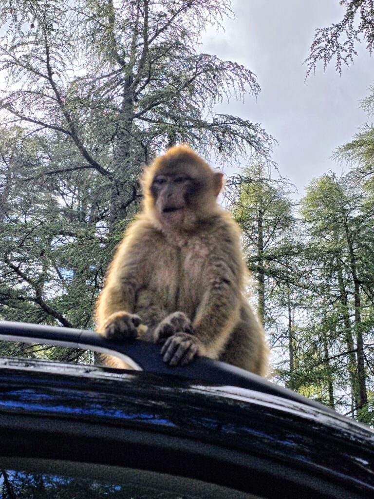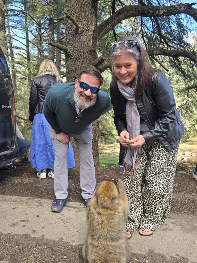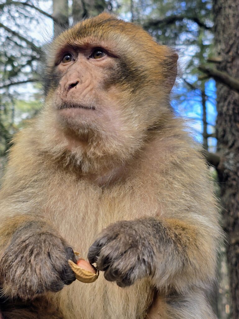 From Ifrane, the landscape shifted again as we drove deeper into the mountains and into the woods. Soufiane pulled over at a stand of tall cedars where we had a short, unexpectedly charming encounter with the local residents: Barbary macaques (often called Atlas macaques). They watched us from the branches at first, then edged closer—curious, expressive, far more interested in us (and the possibility of snacks) than we were prepared for. We didn’t stay long, but it was enough to feel like we’d crossed some invisible line from the urban Morocco we’d known so far into something wilder and older.