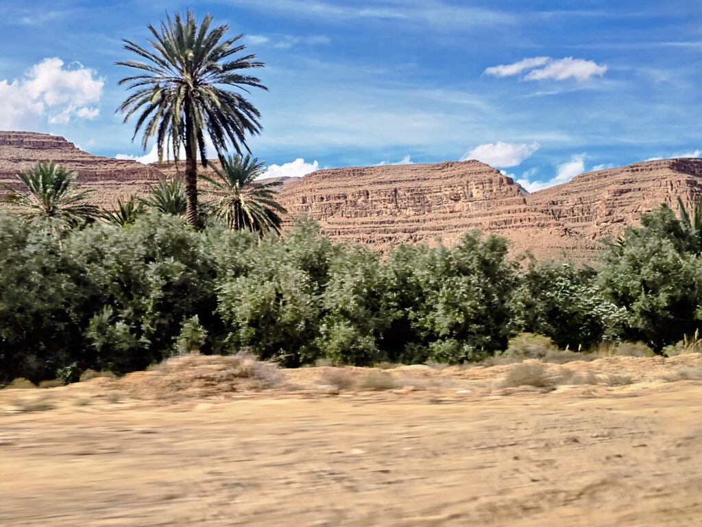 Back on the road, the scenery slowly opened up and dried out. Eventually, Soufiane pointed ahead to a ribbon of green that seemed to unspool along the valley floor: our first view of a long, palm‑filled oasis. After hours of rock, dust, and muted browns, that sudden streak of life felt almost unreal—date palms, small villages, and fields all hugging the watercourse that makes everything possible out here.