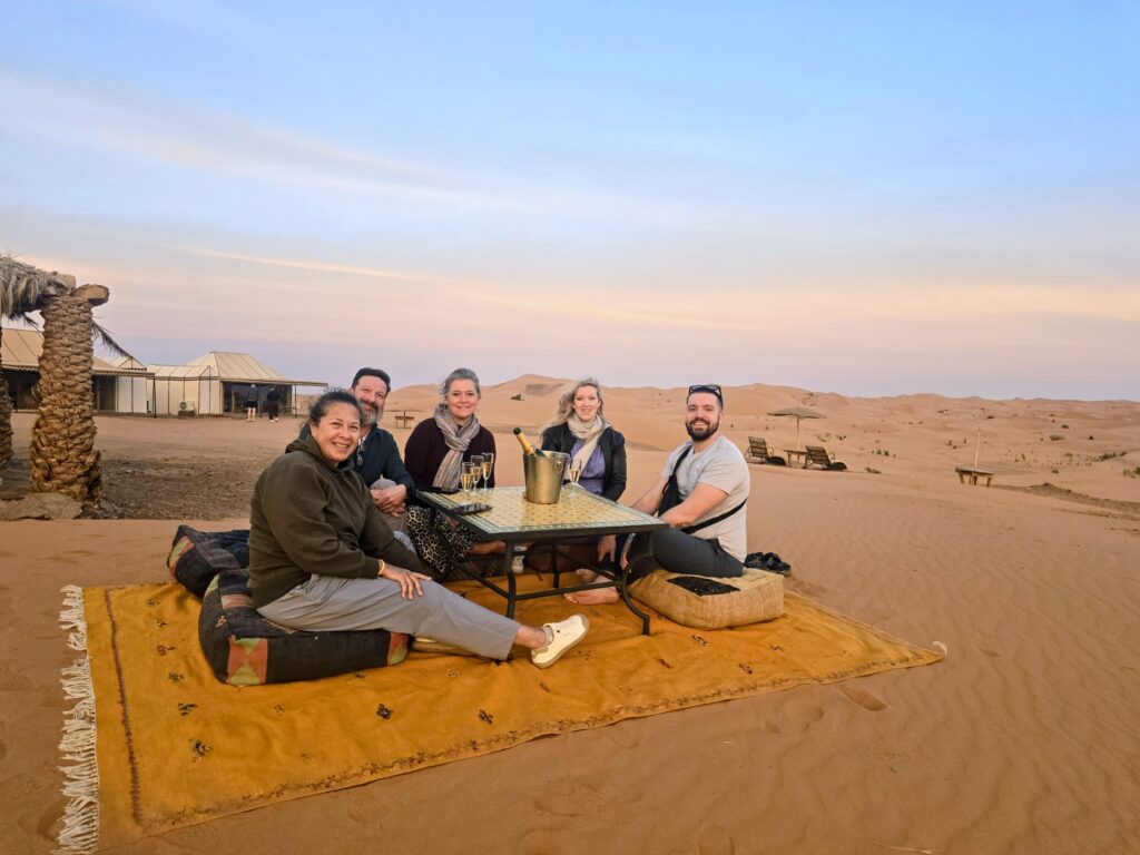 We arrived at camp just as the sky began to soften. Our bags disappeared into tents while we were led up a nearby dune for what might have been the most cinematic moment of the entire trip: a sunset champagne toast in the Sahara. The sand underfoot was still warm from the day; the air had finally cooled. As the sun slid down the horizon, the dunes around us turned from gold to rose to deep, velvety orange. Someone handed us glasses, and there we were—tiny silhouettes on a ridge, watching the light drain from the sky, clinking to a day that had started in mountain pines and ended in a sea of sand.
