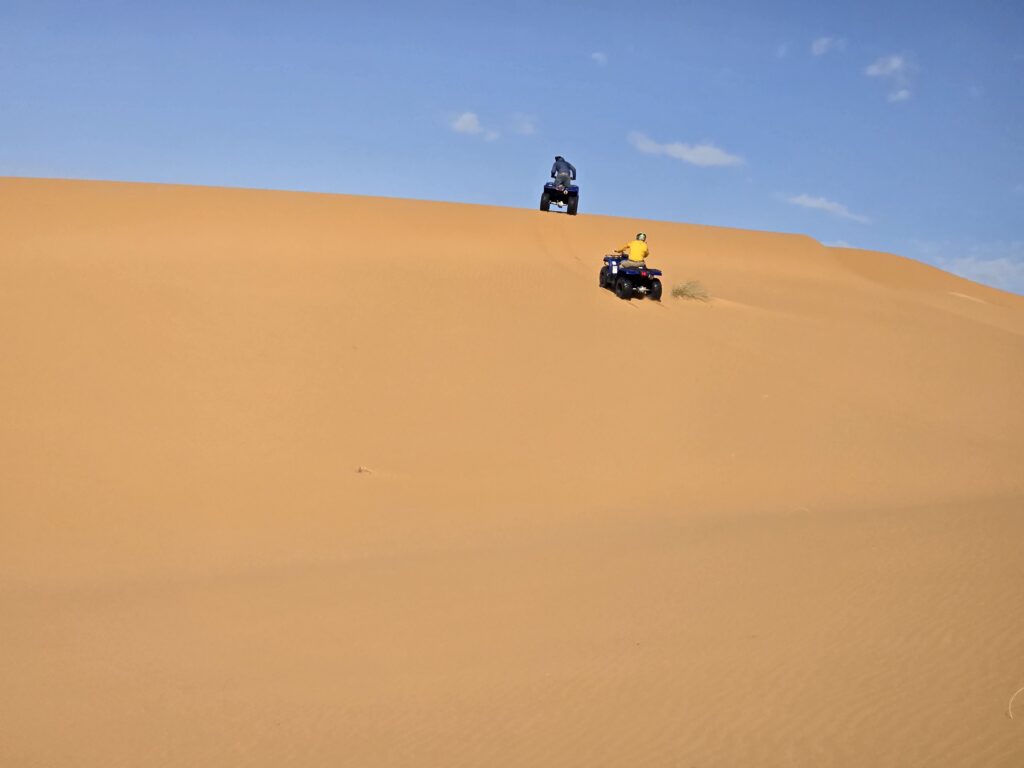 If the camels had been meditative, the buggies were the opposite—loud, fast, and undeniably fun. We tore over rippling stretches of sand, cresting both small and startlingly high dunes, the buggies tilting and sliding just enough to keep our adrenaline up. Now and then we cut the engines and sat in the sudden silence, watching distant camel caravans trace the ridgelines. At one point we spotted a small group up close, their long shadows stretching across the sand; later, a quick flicker of movement resolved into desert foxes darting away, a brief reminder that this seemingly empty landscape is very much alive.