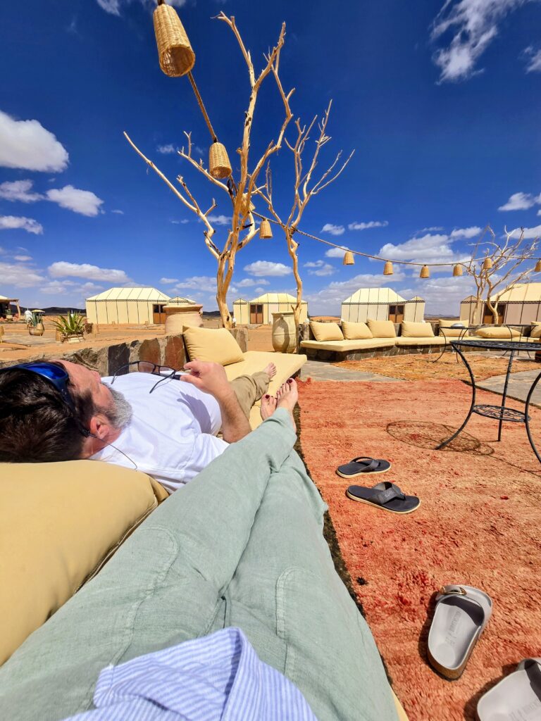 Calling it a “camp” didn’t quite do it justice. From the outside our tent was a simple canvas structure pegged into the sand; inside it was a wayward hotel room that had lost its way and decided to stay: thick rugs layered over the ground, a large bed with crisp white linens and heavy blankets, low tables and lamps casting a warm, honeyed light. Behind a canvas partition there was even a private bathroom with a real shower and flushing toilet—a small modern miracle in the middle of the Sahara.