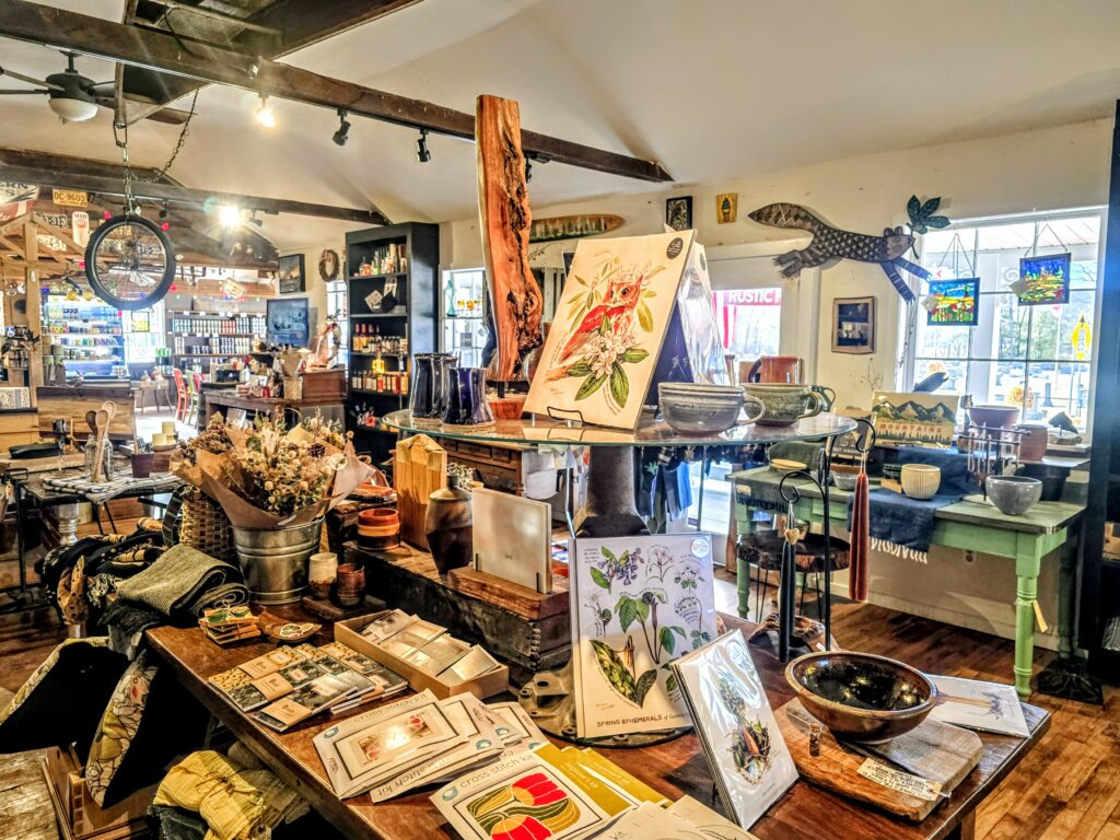 Our next stop was the Lost River Trading Post, a cozy, eclectic space that’s part bakery, part general store, part gallery, and part antique shop. We wandered through its aisles and side rooms, taking in Appalachian artistry at its best—wall-to-wall local craftsmanship, thoughtful exhibits, and quirky vintage finds. Somewhere between the ceramics and the old glassware, we treated ourselves to an Italian hand pie from the bakery counter and a red-spotted newt lapel pin by one of my favorite artists, Rosalie Hazelett—a tiny, wearable reminder of just how much creative energy is tucked into our Appalachian community.